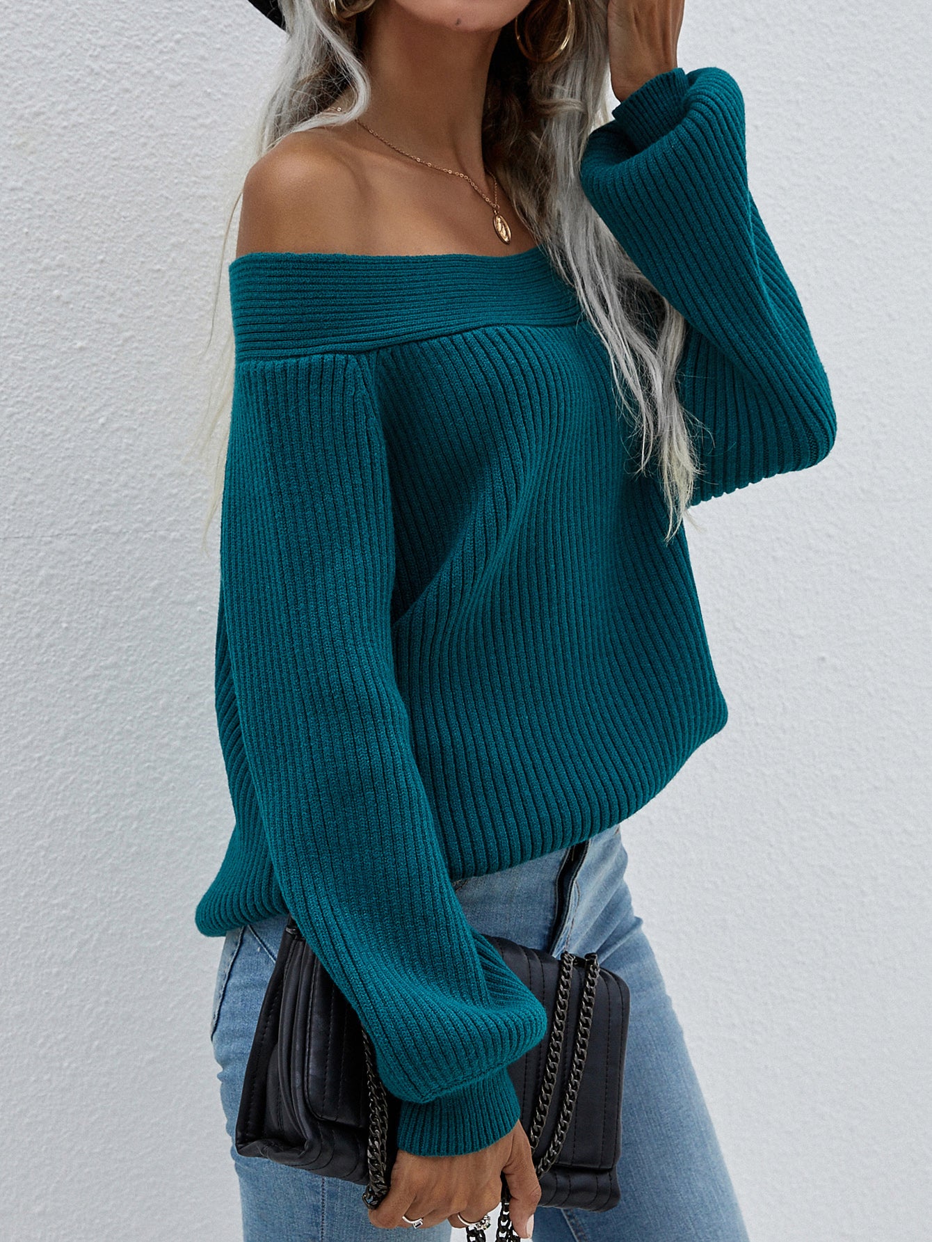 Calistally | Green Bell-Sleeve Off-Shoulder Knit Sweater