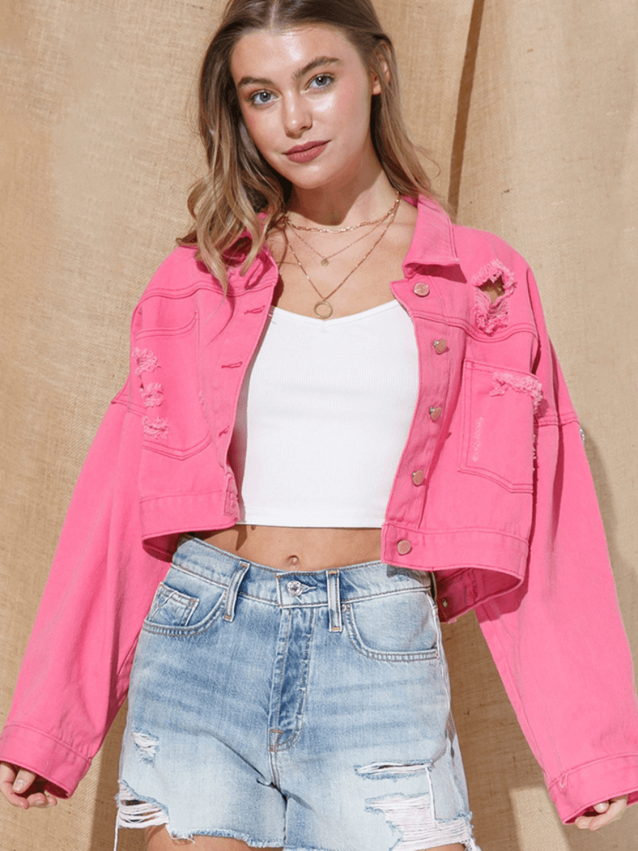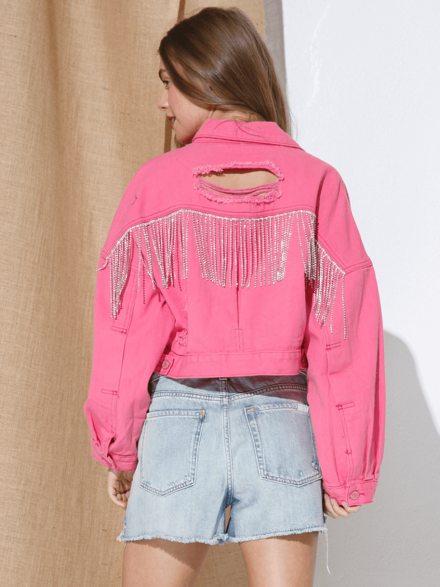 BACK TASSEL SEQUINS RIBBED DENIM JACKET - PINK