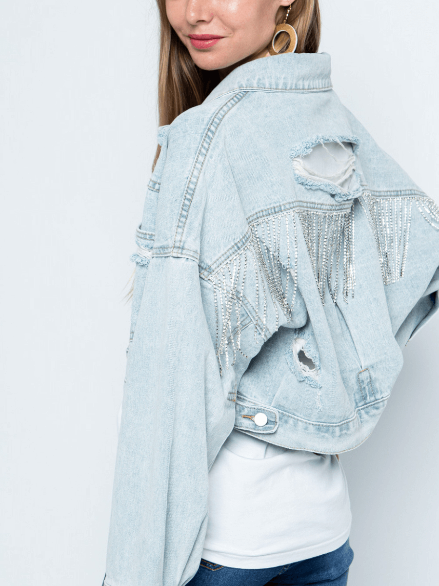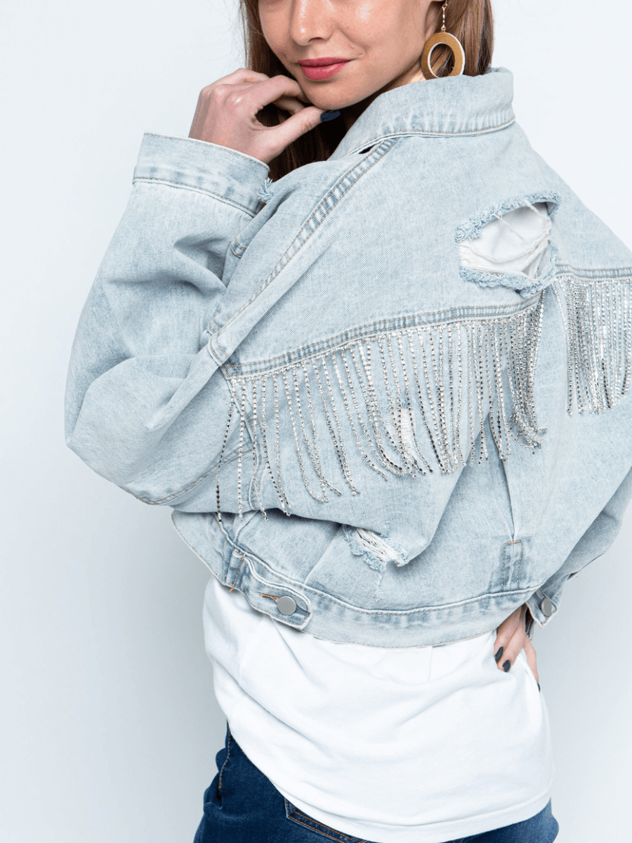 BACK TASSEL SEQUINS RIBBED DENIM JACKET - BLUE