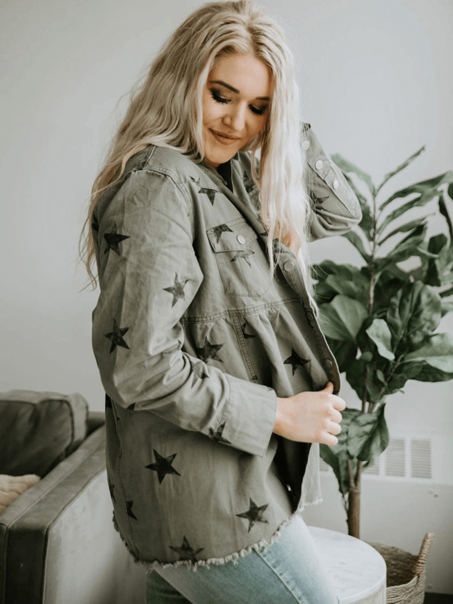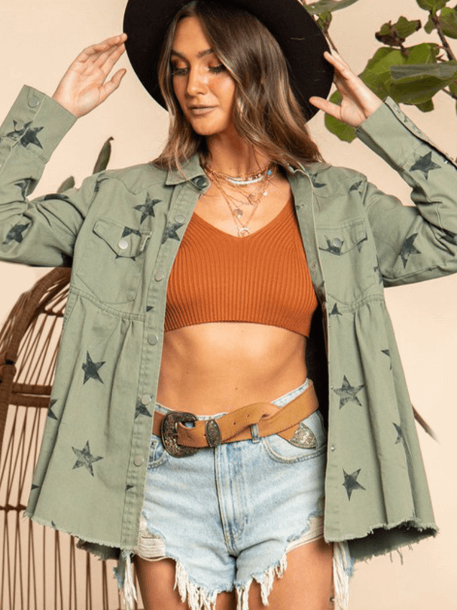 ALL ALIGNED FRAYED STAR DISTRESSED DENIM SHACKET - OLIVE